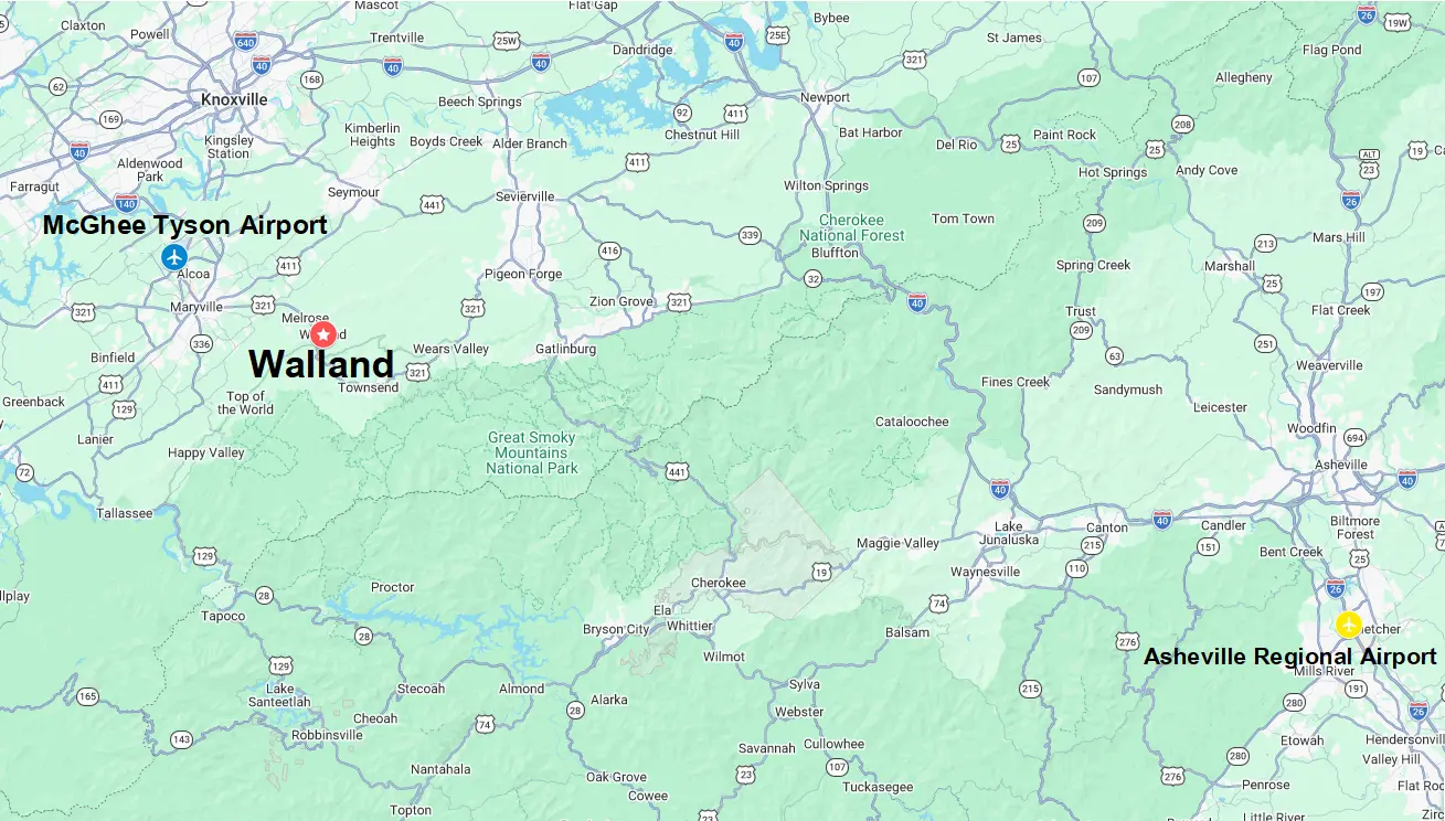 The closest airport is McGhee Tyson Airport (TYS), located about 17 miles away. It’s the most convenient option with a short 20–30 minute drive to Walland.